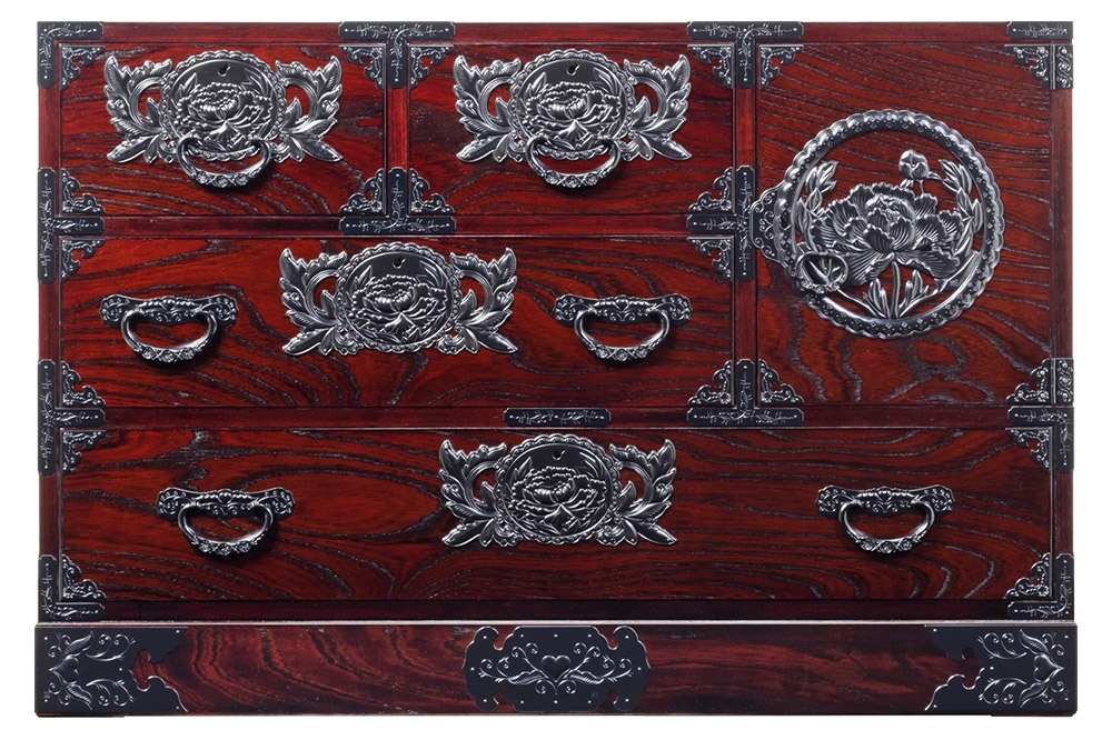 【彫金手打金具】仙台箪笥 舟箪笥 ≪鶴亀松竹梅≫ 朱色漆塗り (申…