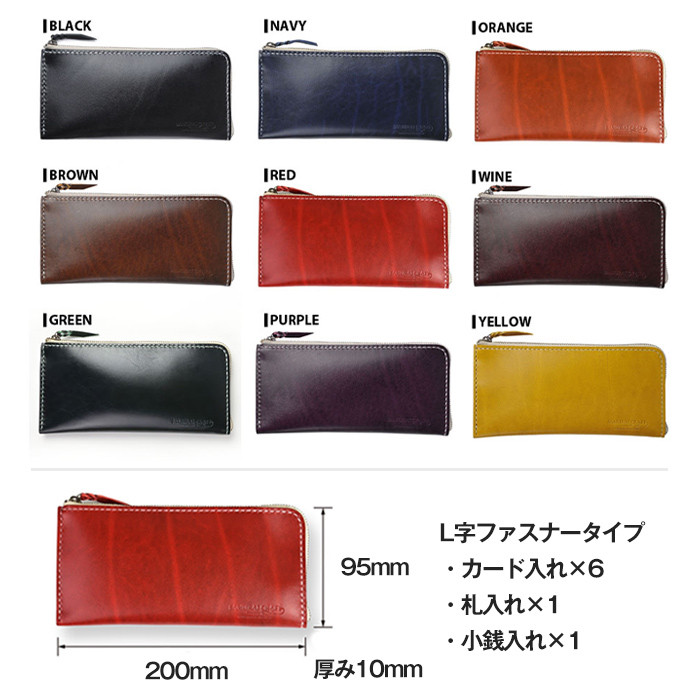 | 容量 | Lファスナー ロングウォレット ■サイズ:200×95×厚み10mm (カード入れ×6 札入れ×1 小銭入れ×1) ★「種類」欄からお好みの素材・色をお選びください。 ・ブラック ・ネイビー ・オレンジ ・ブラウン ・レッド ・ワイン ・グリーン ・パープル ・イエロー <色見本はページ内の画像をご覧ください> ※シニュー糸による完全手縫い仕上げ |