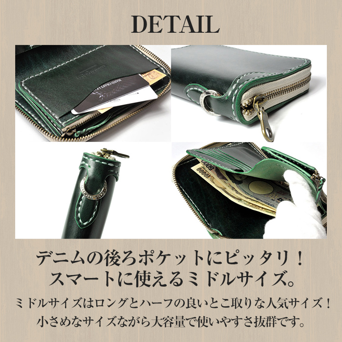 | 容量 | ■品名:ラウンドファスナーミドルウォレット TYPE-3 ■素材:ルガトショルダー ■サイズ:150×90×厚み25mm ■ファスナーカラー 外側/内側:ベージュ(金具/アンティークゴールド) ■仕様:カードケース×5 札入れ×1 小銭入れ×1 マチなしポケット×1 カードポケット×1 チェーン取付金具(丸カン)付き ※シニューによる完全手縫い仕上げ。 ★こちらは「ブラック」となります。 |