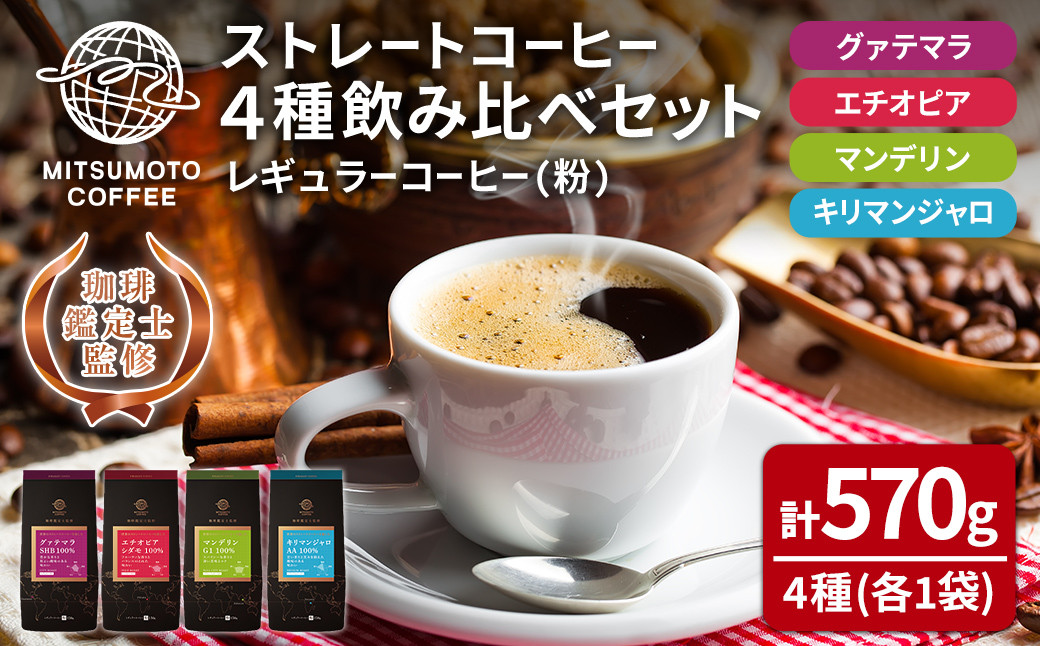 世界のストレートコーヒーをお家で愉しめる、4種の飲み比べセット! 三本珈琲 ストレートコーヒー レギュラーコーヒー (粉) 飲み比べセット 計570g 4種 グアテマラ エチオピア キリマンジャロ タンザニア マンデリン インドネシア 珈琲 コーヒー豆 珈琲豆【三本珈琲株式会社】ta420