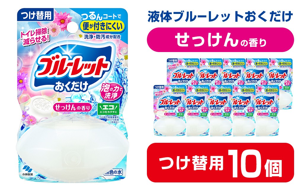 表面コートで汚れに強くなる! 泡の力で輝く便器! 液体ブルーレットおくだけ せっけんの香り 70ml つけ替用 10個 無色の水 小林製薬 ブルーレット トイレ用合成洗剤 トイレ掃除 洗剤 芳香剤 詰め替え 詰替え 付け替え 付替え【CGC】ta448