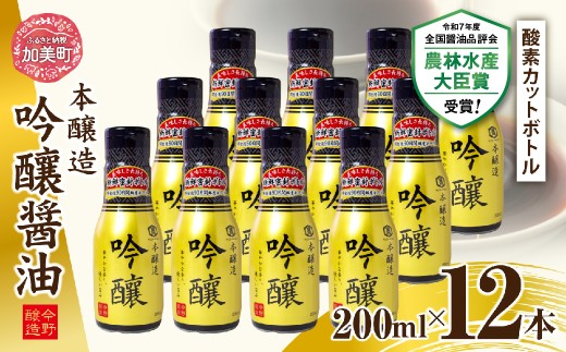 明治36年創業の老舗蔵元有限会社今野醸造自慢の吟醸醤油。鮮度抜群の酸素カットボトル(200ml)を12本セットでお届けします。