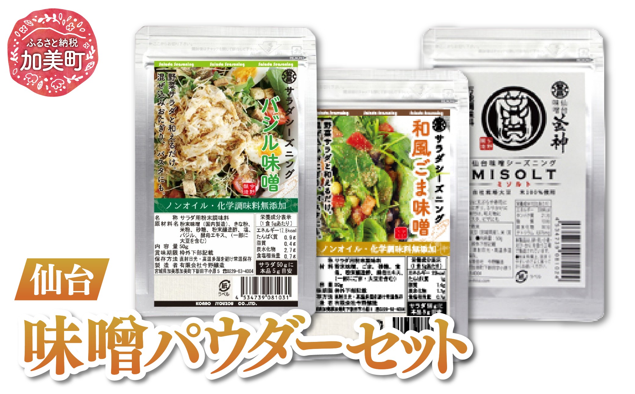 新感覚 ! ふりかける味噌とサラダシーズニング 調味料 仙台味噌パウダー ミソルト&サラダシーズニング(和風ごま味噌&バジル味噌)各50g×1p 計3p [今野醸造 宮城県 加美町 44581368] シーズニング パウダー ノンオイル みそ ミソ