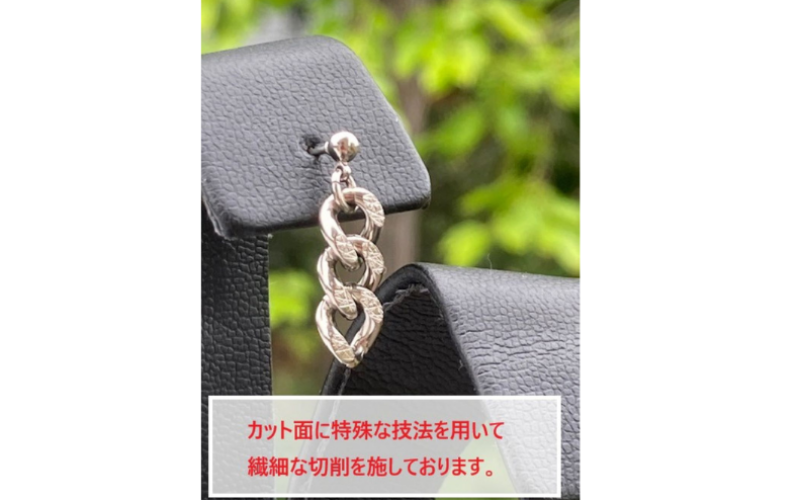 寄付者の皆様に喜んで頂きたく、通常の喜平の面に特殊な技法を用いて1本1本繊細な切削し、面がまるでダイヤモンドのように煌めく高級感のある喜平をチャームにしたピアスです。
