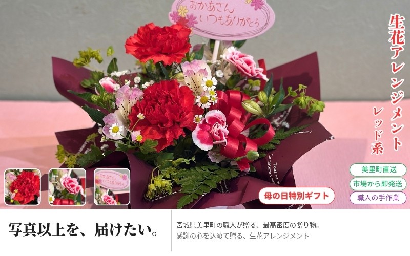 「母の日」に感謝の心を込めて贈る~生花アレンジメント~レッド系 ※沖縄・離島への配送不可 / 母の日 ははの日 お花 花 赤 レッド ピンク 感謝 贈答 プレゼント 花束 カーネーション ばら バラ 薔薇 アレジメント サプライズ 母 記念日【hanm010】