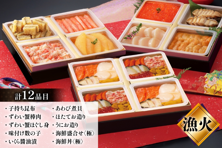 \冷凍なのに、まるで生!鮮度抜群!海鮮づくしおせち/ 【期間限定発送】 漁師めし 海鮮おせち 三段重 「漁火」★12/26-30でお届け★ [歌津小太郎 宮城県 南三陸町 m304amh590065] お節 おせち料理 冷凍 お節料理 年内発送 3段 和風 2026 海鮮 アワビ いくら ウニ 雲丹 数の子 カニ 蟹 ホタテ 帆立 ほたて 魚介 魚介類 小分け 個包装