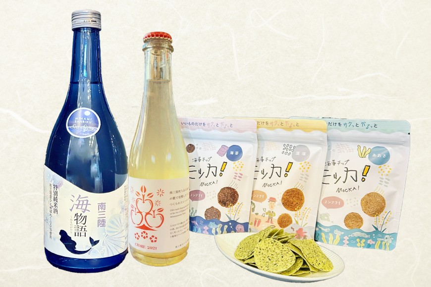 南三陸の恵みを味わう日本酒・シードル・海藻チップ詰め合わせ 日本酒 特別純米酒 南三陸海物語 1本 南三陸シードル 2本 海藻チップ モッカ 3種 セット ギフトカートン入 [佐長商店 宮城県 南三陸町 m304amh760008] 酒 純米酒 特別純米 ギフト 贈り物 ギフト用 プレゼント ひとめぼれ シードル 海藻 チップス