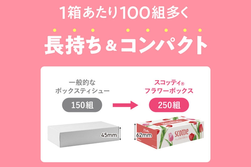 ●1箱250組入で、箱の取り替え回数が減らせる長持ちティシュー。