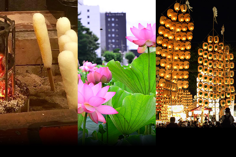 秋田市で開催される東北三大まつりの1つ「秋田竿燈まつり」は、俵型をした提灯を竿に吊して大きな稲穂に見立て、竿を操って力と技を競う祭りです。通りを埋め尽くす竿燈の光が黄金色に輝く、その妙技は圧巻です。