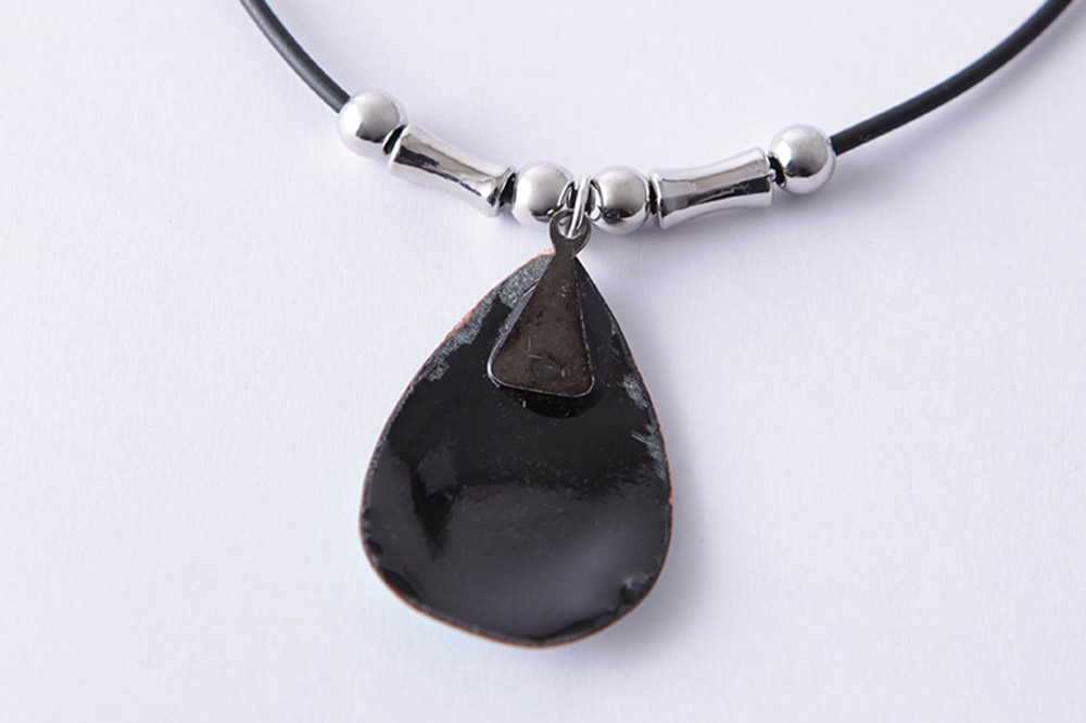 銅板を切り七宝釉薬をのせ銀箔でデザインし焼成しました。