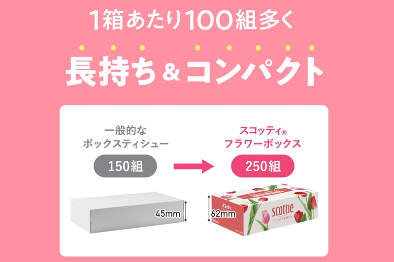 1箱250組入で、箱の取り替え回数が減らせる長持ちティシュー。