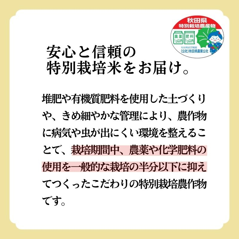 栽培期間中、化学肥料、節減対象農薬を慣行栽培の5割以下で栽培した秋田県認証の特別栽培米です。