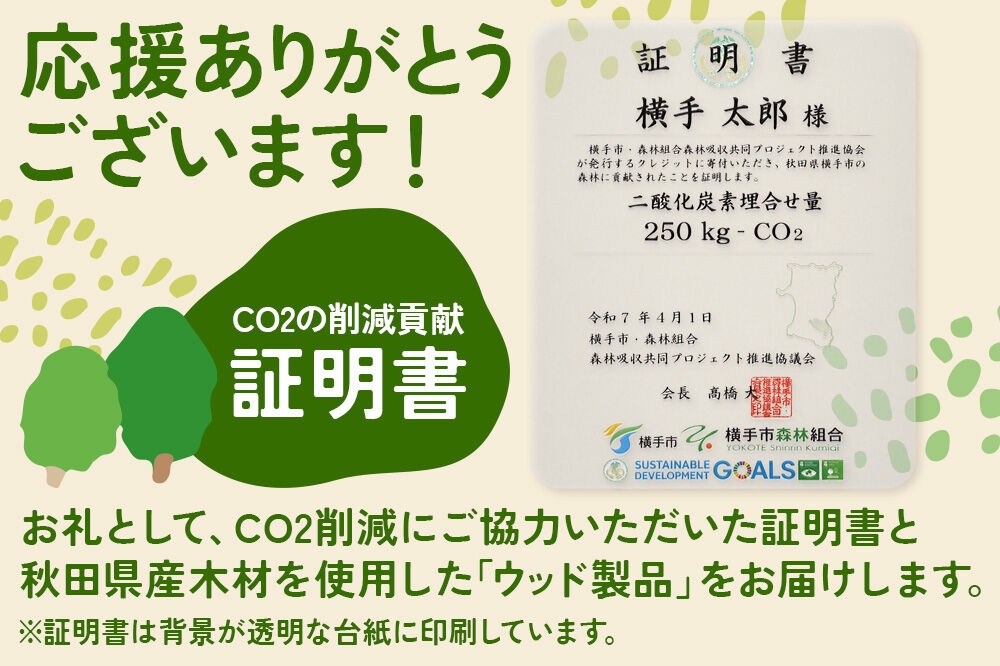 横手J-クレジットは、国に認証された「横手の森林が持つCO2を吸収できる能力」のことで、CO2排出権として皆様にご活用いただいています。こちらをお選びいただくと、寄附金を植樹や間伐などの、横手の森林を守る活動に活用させていただきます。また、ご寄附いただいたお礼として、1.25t相当のCO2の削減(1人が生活で排出する約208日分)に貢献いただいた「証明書」と、秋田県産木材を使用した「ウッド製品(木製スマホスタンド)」をお贈りします。木製スマホスタンドは名刺や証明書スタンドとして活用することもできます。(スタンドの柾目を活かすため、証明書は背景を透明にしております。)