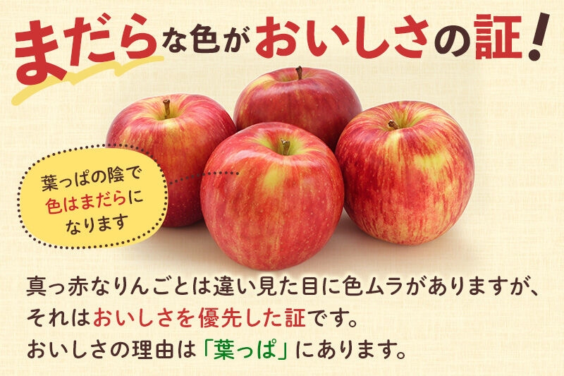 赤いりんごをつくるには太陽の光が果実に当たるように葉っぱを取りますが、葉とらずふじは葉っぱを取らないために着色がまだらです。