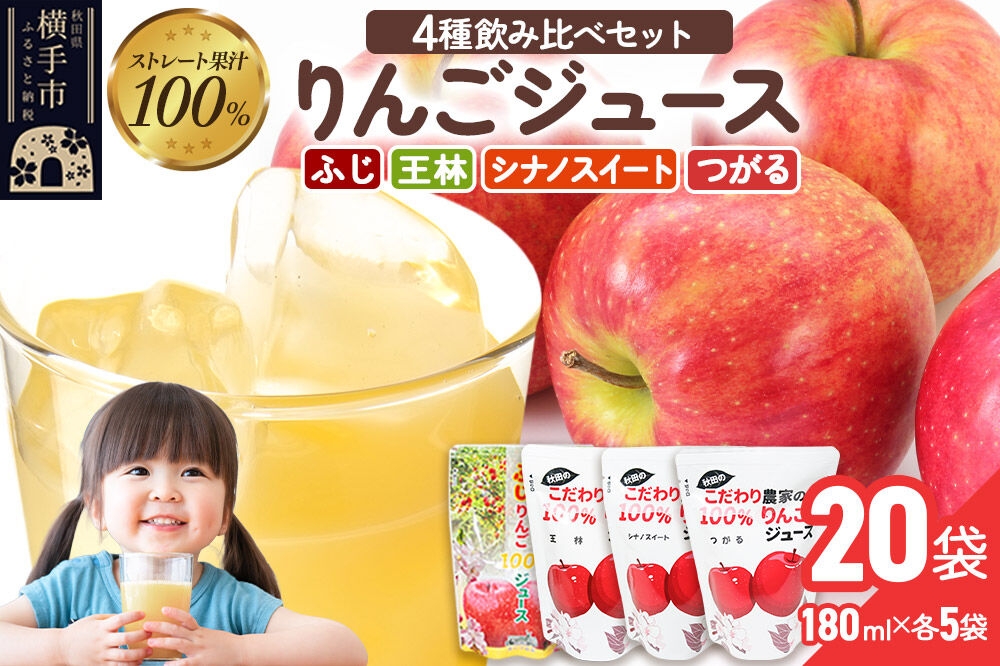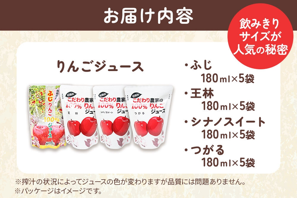 だいごの丘 4種のりんごジュース飲み比べセット(ふじ・王林・シナノスイート・つがる)合計20袋(4種×各5袋) [りんご リンゴ 林檎 ストレート 甘味料不使用 果汁100% ふじ フジ 王林 おうりん シナノスイート しなのすいーと つがる 飲み比べ 飲みくらべ]