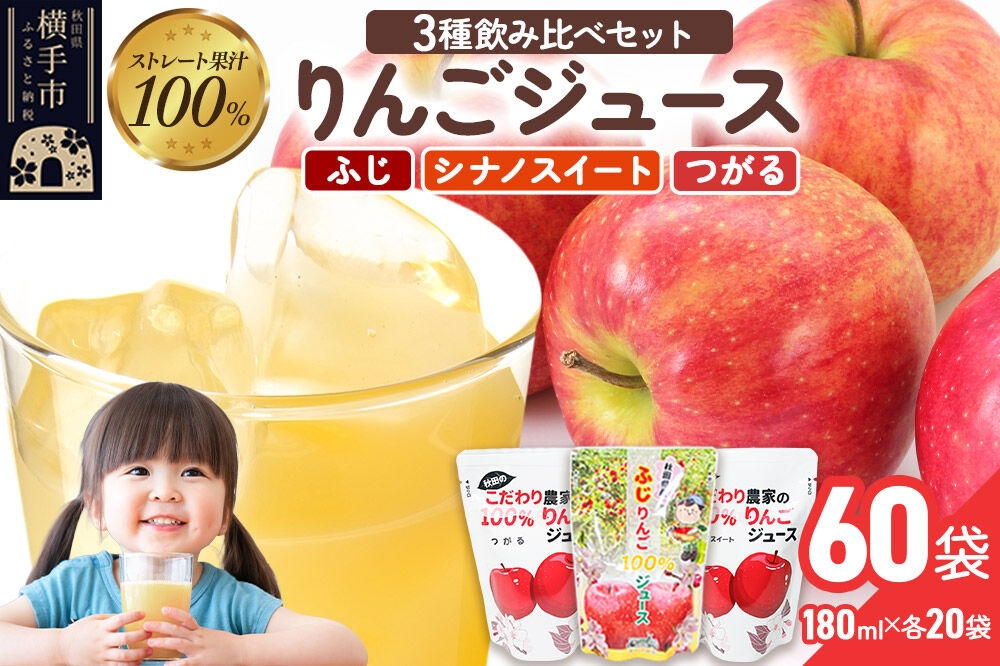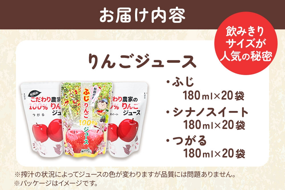 だいごの丘 3種のりんごジュース飲み比べセット(ふじ、シナノスイート、つがる)合計60袋(3種×各20袋) [りんご リンゴ 林檎 ストレート 甘味料不使用 果汁100% ふじ フジ シナノスイート つがる ジュース 飲み比べ 飲みくらべ 秋田県産]