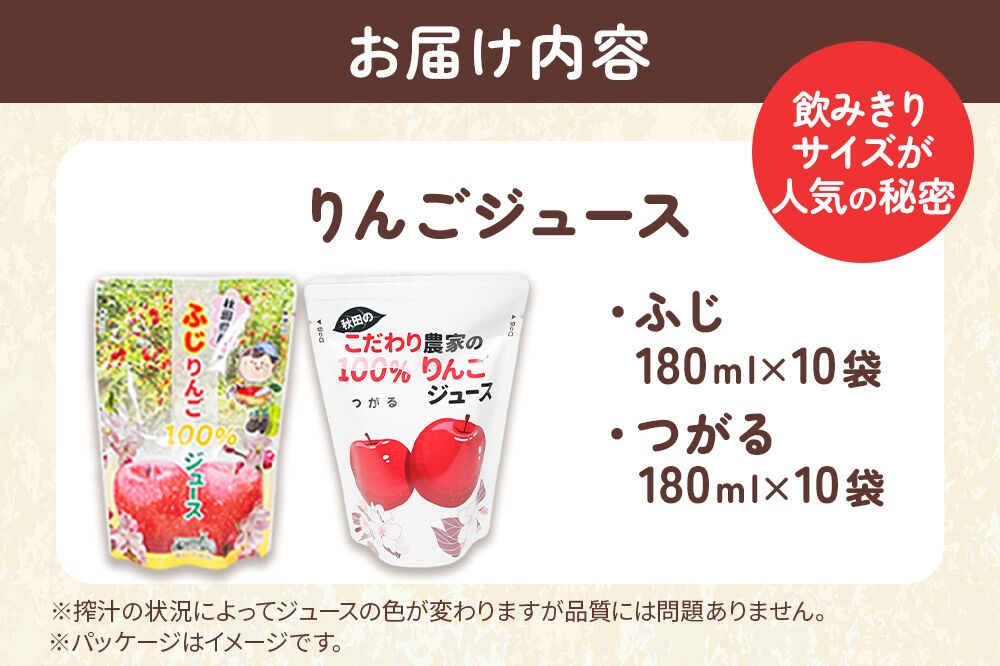 だいごの丘 2種のりんごジュース飲み比べセット(ふじ、つがる)合計20袋(2種×各10袋) [りんご リンゴ 林檎 ストレート 甘味料不使用 果汁100% ふじ フジ つがる ジュース 飲み比べ 飲みくらべ 秋田県産]