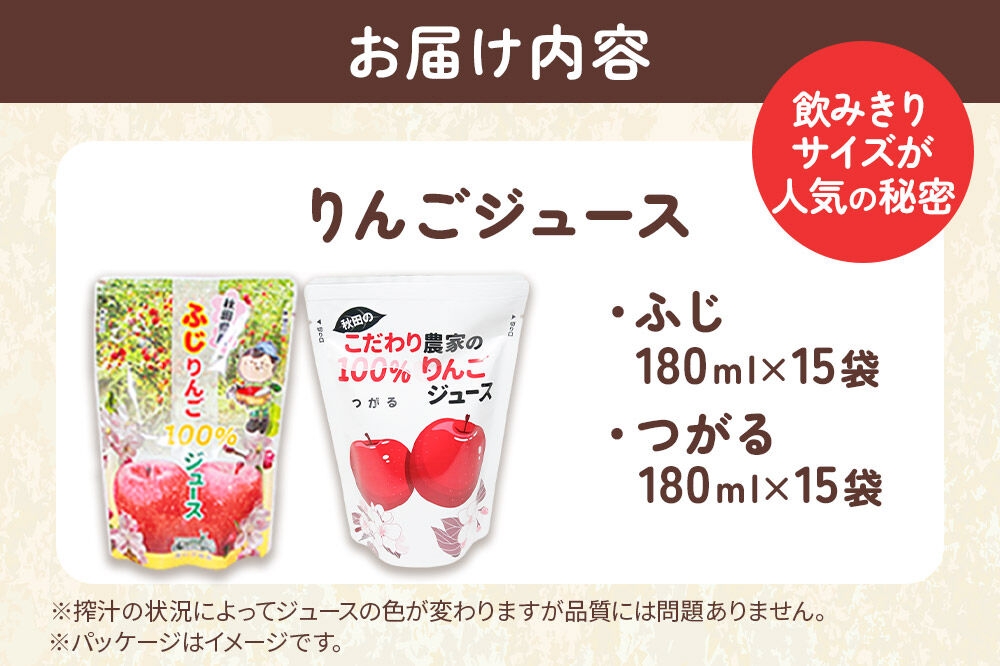 だいごの丘 2種のりんごジュース飲み比べセット(ふじ、つがる)合計30袋(2種×各15袋) [りんご リンゴ 林檎 ストレート 甘味料不使用 果汁100% ふじ フジ つがる ジュース 飲み比べ 飲みくらべ 秋田県産]