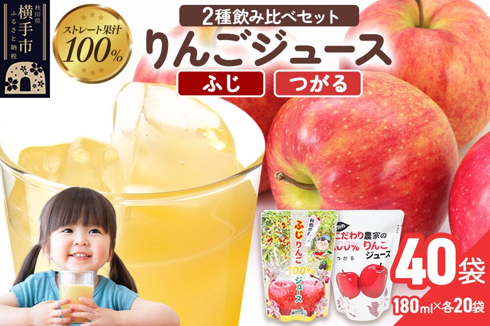 だいごの丘 2種のりんごジュース飲み比べセット(ふじ、つがる)合計40袋(2種×各20袋) [りんご リンゴ 林檎 ストレート 甘味料不使用 果汁100% ふじ フジ つがる ジュース 飲み比べ 飲みくらべ 秋田県産]