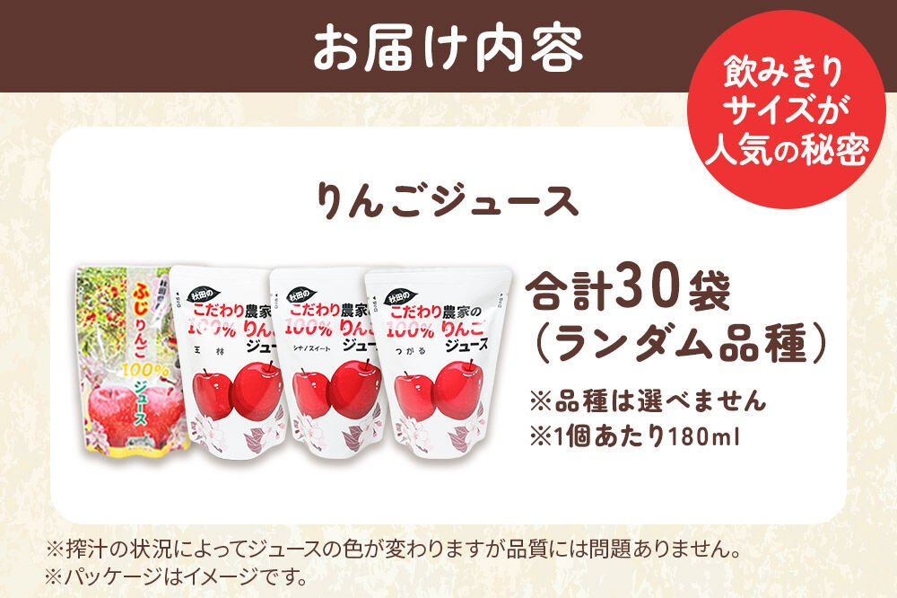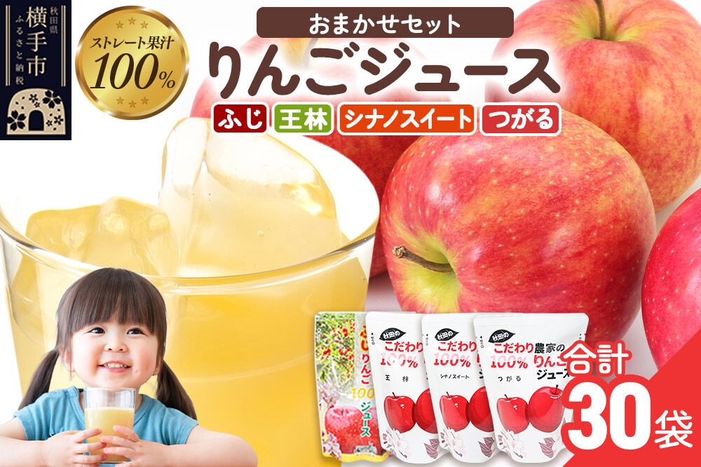 だいごの丘 りんごジュース おまかせパック(ふじ、つがる、シナノスイート、王林) 合計30袋 [りんご リンゴ 林檎 ストレート 甘味料不使用 果汁100% ふじ フジ シナノスイート つがる 王林 ジュース ランダム おまかせ 秋田県産]