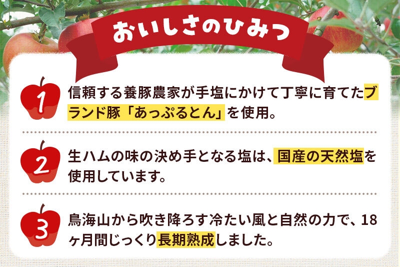 これらだけで作った18ヶ月熟成の国産生ハムです。一般的な豚肉より1.5倍もビタミンB1が高い(※)あっぷるとんを熟成することで、さらに高い栄養価を期待できます。また2019年7月に軽井沢で開かれた生ハムフェスティバルでは、塩分控えめな「あっぷる豚生ハム」が高評価を頂きました。