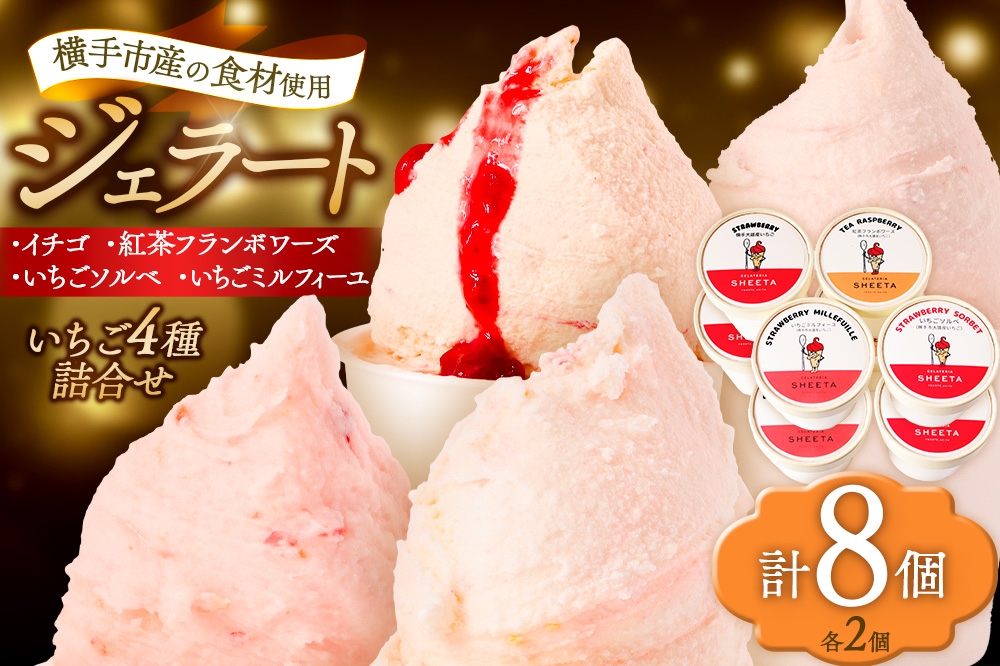 秋田県横手市の地元農家さんと連携。新鮮素材をジェラートにしました。 ジェラート詰合せ いちごセット(イチゴ・いちごソルベ・紅茶フランボワーズ・いちごミルフィーユ)約100g×8個(各種2個ずつ)