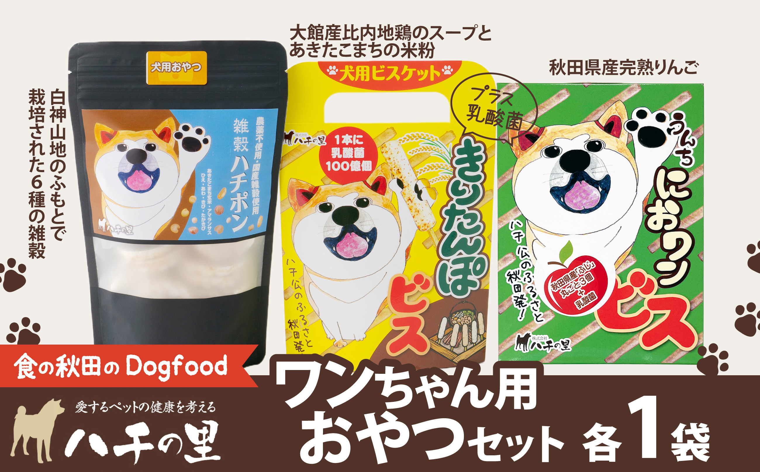 「雑穀ハチポン」・・・世界遺産白神山地の麓の農地で農薬を使わずに育てた6種類の雑穀(あきたこまち玄米・アマランサス・ひえ・あわ・きび・たかきび)で作ったポンせんべいです。サクサクとした食感と香ばしい香りが特徴です。雑穀は栄養価が高く、食物繊維が豊富なことからダイエット中のワンちゃんにも最適です。