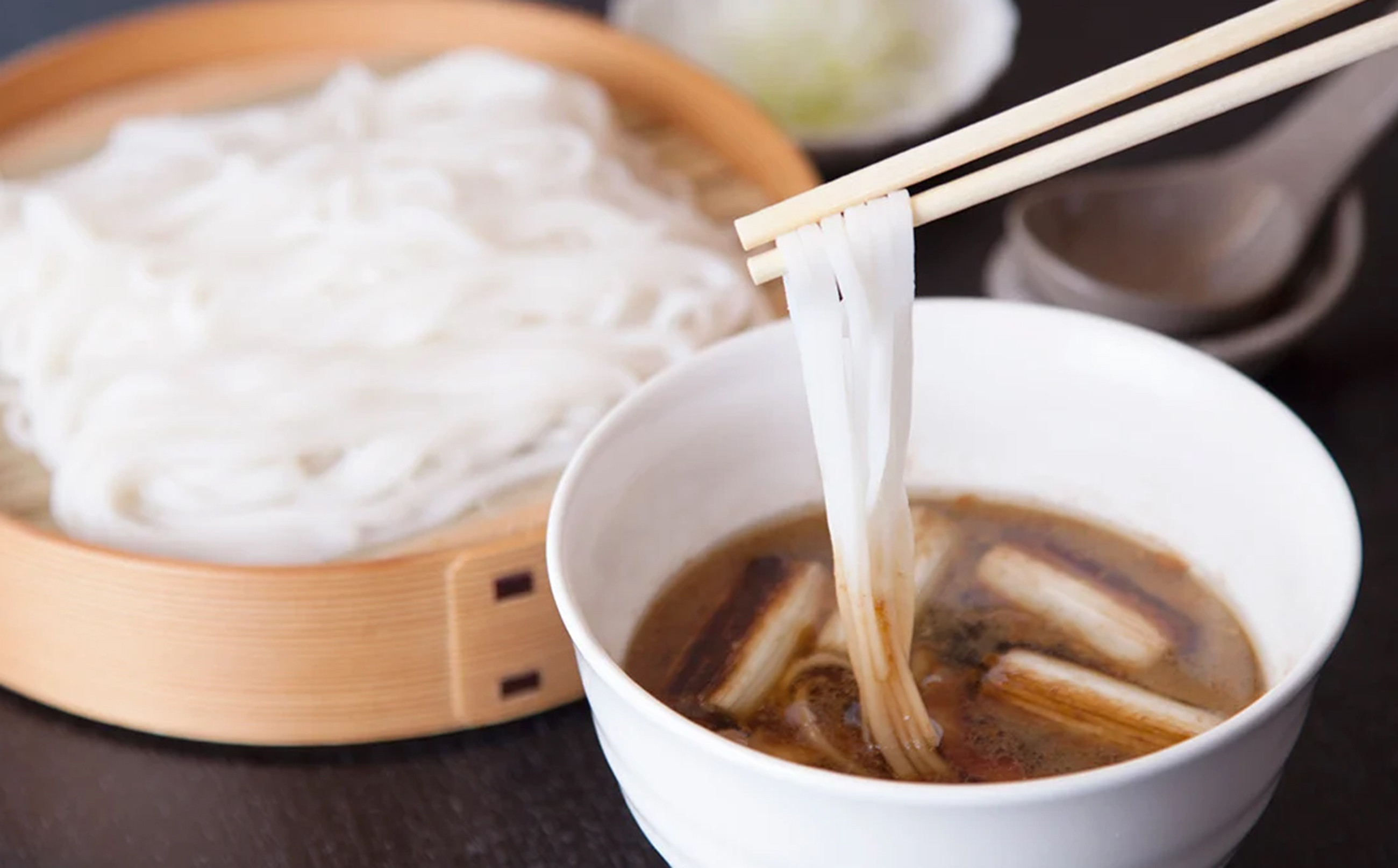 この製法で製粉したOGURA製のうどん「舞麺」は、つなぎを使わずに製麺することができ、ツルツルしてコシがあり、時間が経っても延びないのが特徴です。