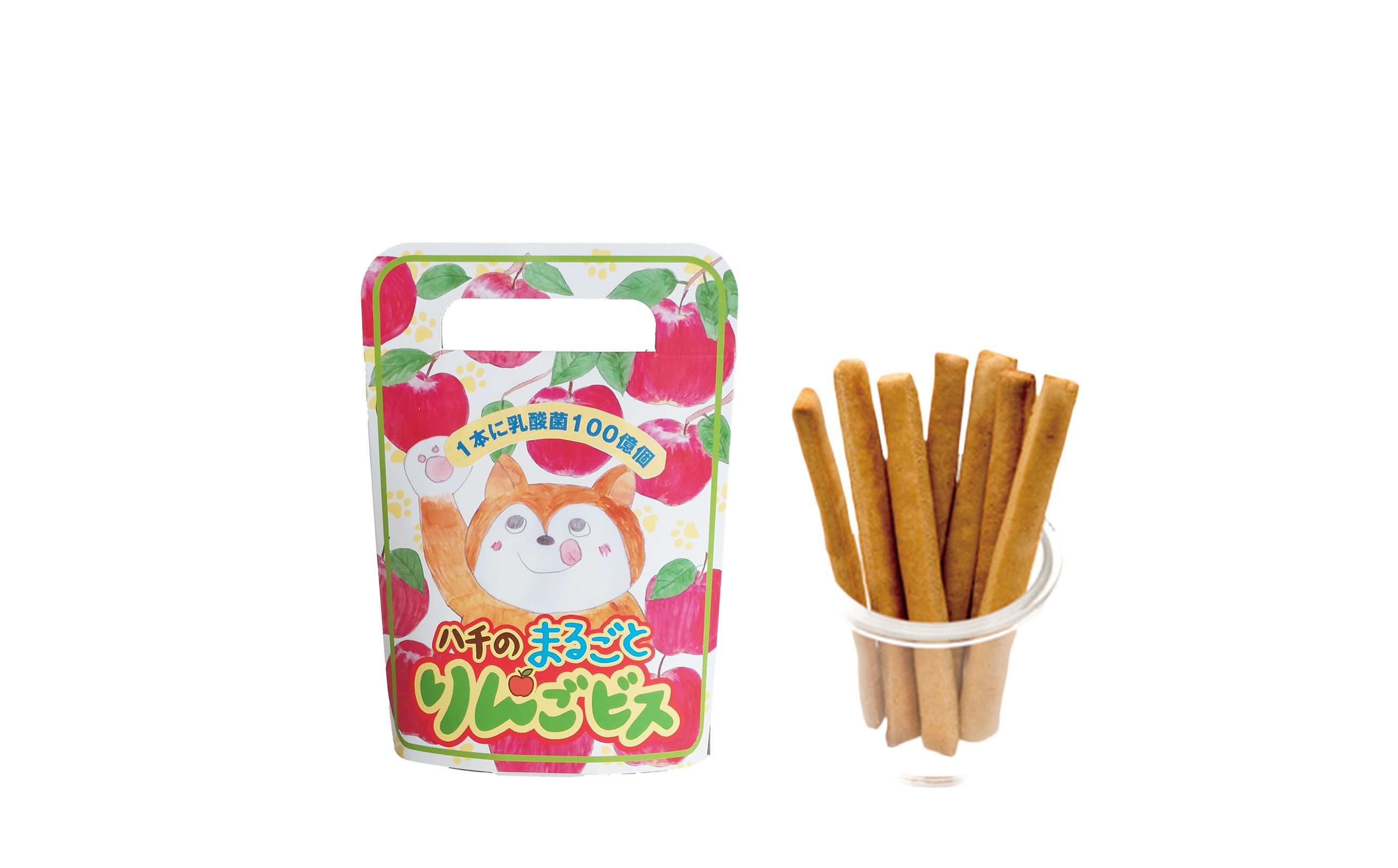 「ハチのまるごとりんごビス」・・・秋田県産完熟りんご「ふじ」をまるごと使い、さらに腸を整え免疫力を挙げる効果のある乳酸菌を1本に100億個加えて焼き上げました。リンゴと乳酸菌、2つの力で気になる体臭や排泄物の臭いを抑えます。保存料・防腐剤などを一切使用していないワンちゃんの健康を考えたビスケットです。