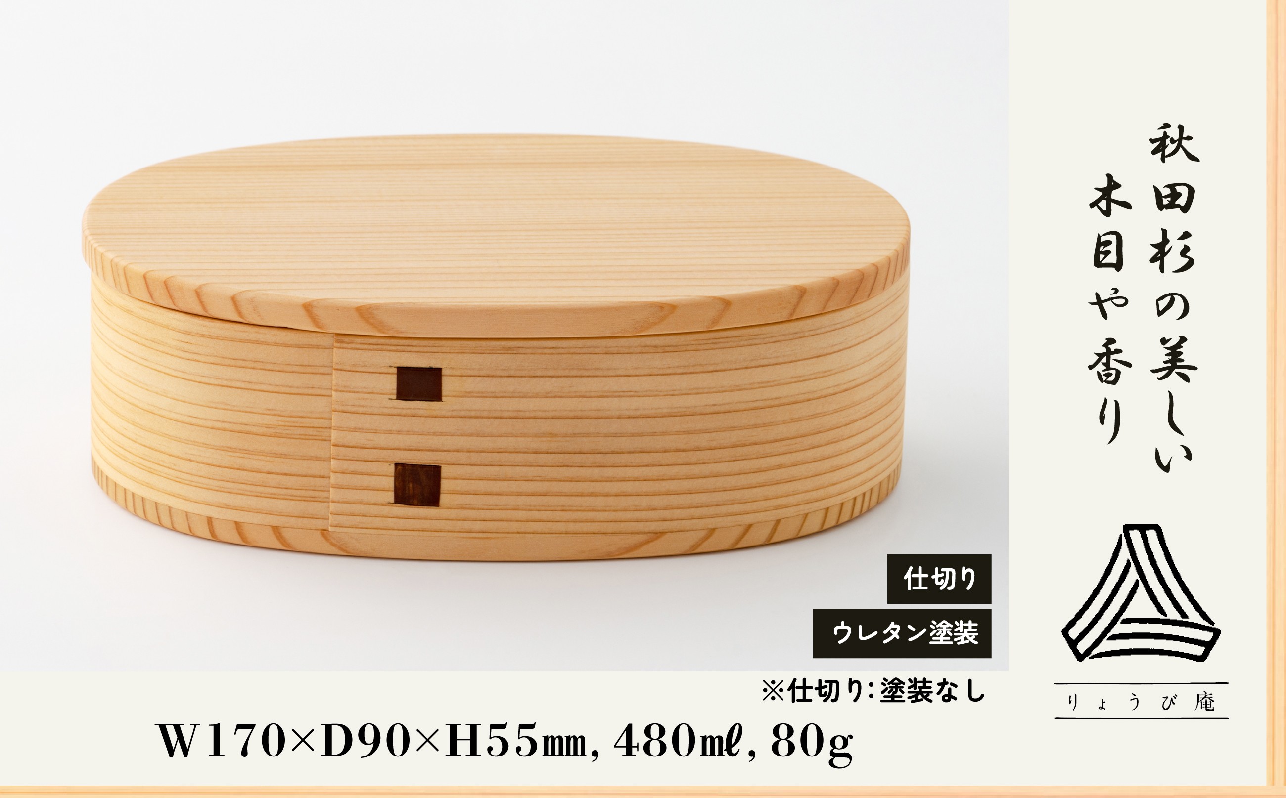| 容量 | W170×D90×H55mm 480ml、80g 仕切り付 【注意】品質保持のため容器にウレタン塗装を施しております。 ※仕切りは無塗装です |