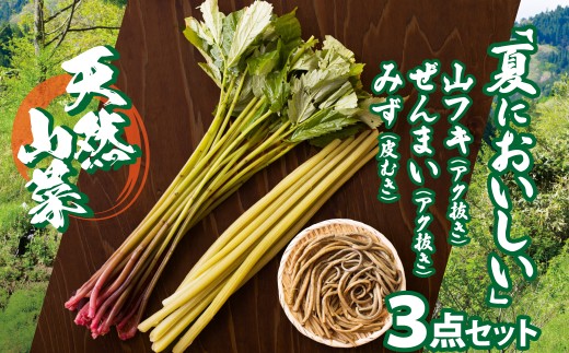 チョイス限定 天然山菜3点セット(みず・ふき・ぜんまい) 予約受付【天然山菜】「夏においしい」3点セット 60P3226 / 山 みず ミズ ふき フキ ぜんまい ゼンマイ 山菜 自然 天然 東北 秋田 大館 天然山菜 天然もの 手間いらず 下処理不要 処理不要 天然山菜セット 山菜セット 春の山菜セット あく抜き済み うわばみ草 ウワバミ草 ぜんまいの煮もの 蕗 山菜詰め合わせ