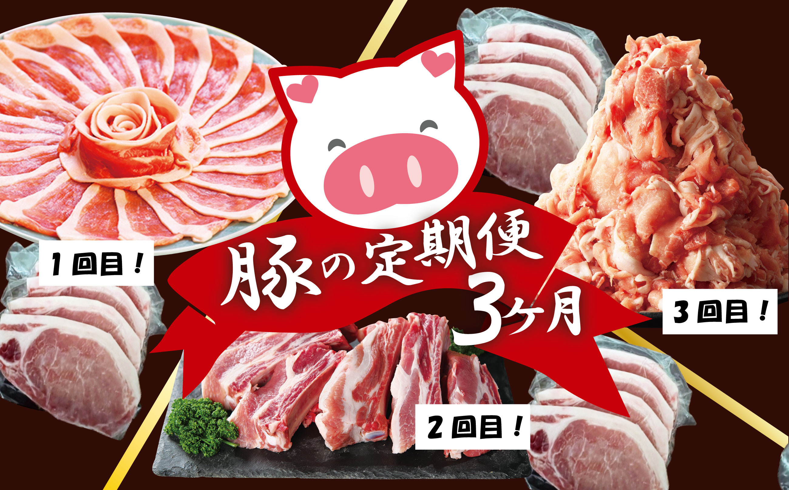 | 容量 | 1回目:豚すきしゃぶ肉1kg、豚ロース400g(100g×4枚) 2回目:ポークスペアリブ1.5kg、豚ロース400g(100g×4枚) 3回目:豚切り落とし1kg(500g×2袋)、豚ロース400g(100g×4枚) |