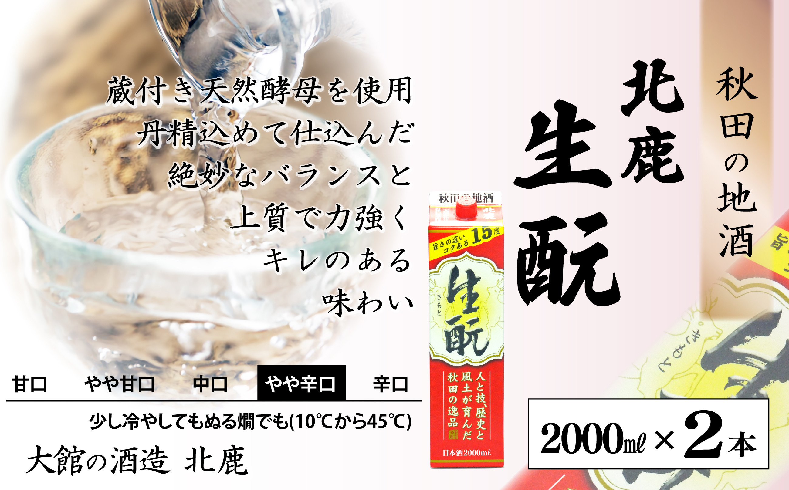 芳醇タイプでやや辛口のお酒、北鹿『濃醇辛口 生もとパック』2000ml×6本