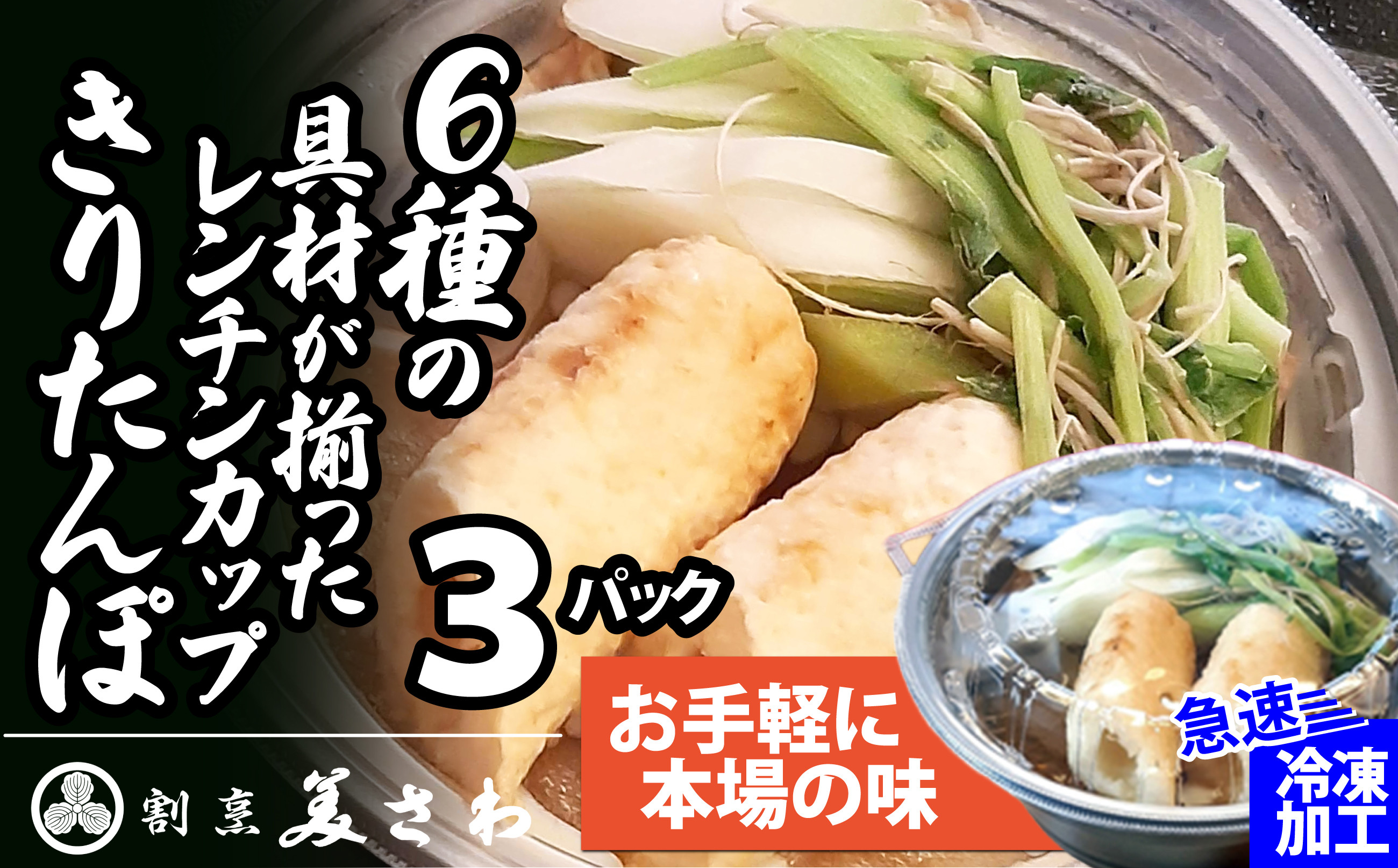 レンチンするだけ!割烹の味をご家庭で楽しめます。 【割烹美さわ】6種の具材が揃ったレンチンカップきりたんぽ(3パック) 60P1251 / 本場 きりたんぽ 鍋 比内地鶏 比内鶏 郷土 料理 簡単 調理 ひないどり ブランド肉 野菜芹 セリ まいたけ ごぼう だし キリタンポ なべ 食材 出汁 取り寄せ 東北 秋田 手軽 ご当地 レンジ レンチン レンジアップ 東北 秋田 大館 大館市 ひないじどり ヒナイジドリ ヒナイドリ きりたんぽ鍋