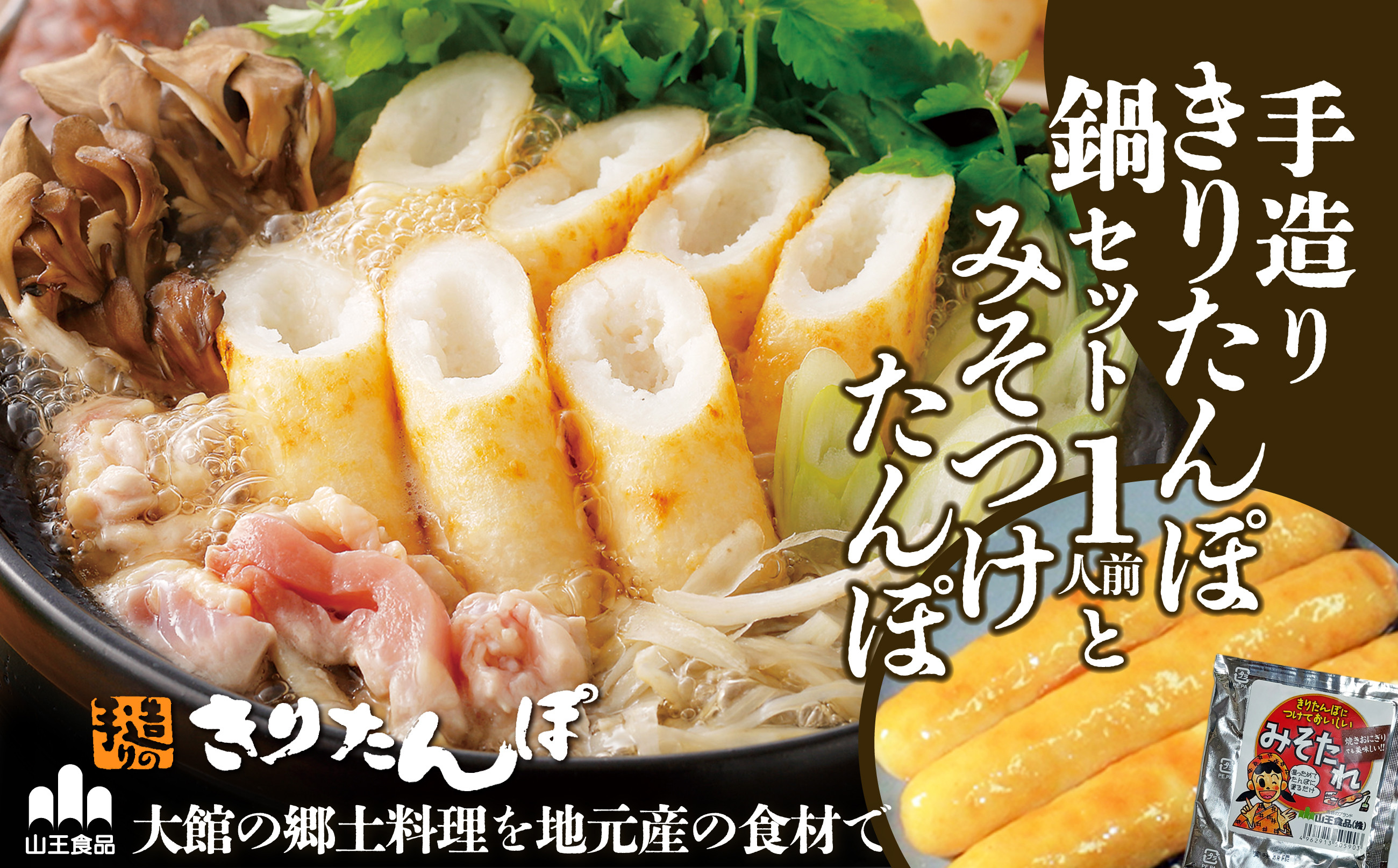 昔ながらの職人の手作業により、秋田杉の串を用いて1本1本丁寧につくられたきりたんぽ。肉厚でもっちりとした食感はお鍋に入れても煮崩れしにくく、香ばしい香りと味を楽しめます。放し飼いで育てられた比内地鶏と深い味わいの比内地鶏スープが入っています。さらにきりたんぽ鍋とはまた違うもっちり食感で味わえるおやつ感覚のきりたんぽ『みそ付けたんぽ』をセットにしました。甘みそで仕上げ手軽に食べられます。是非ご賞味下さい。