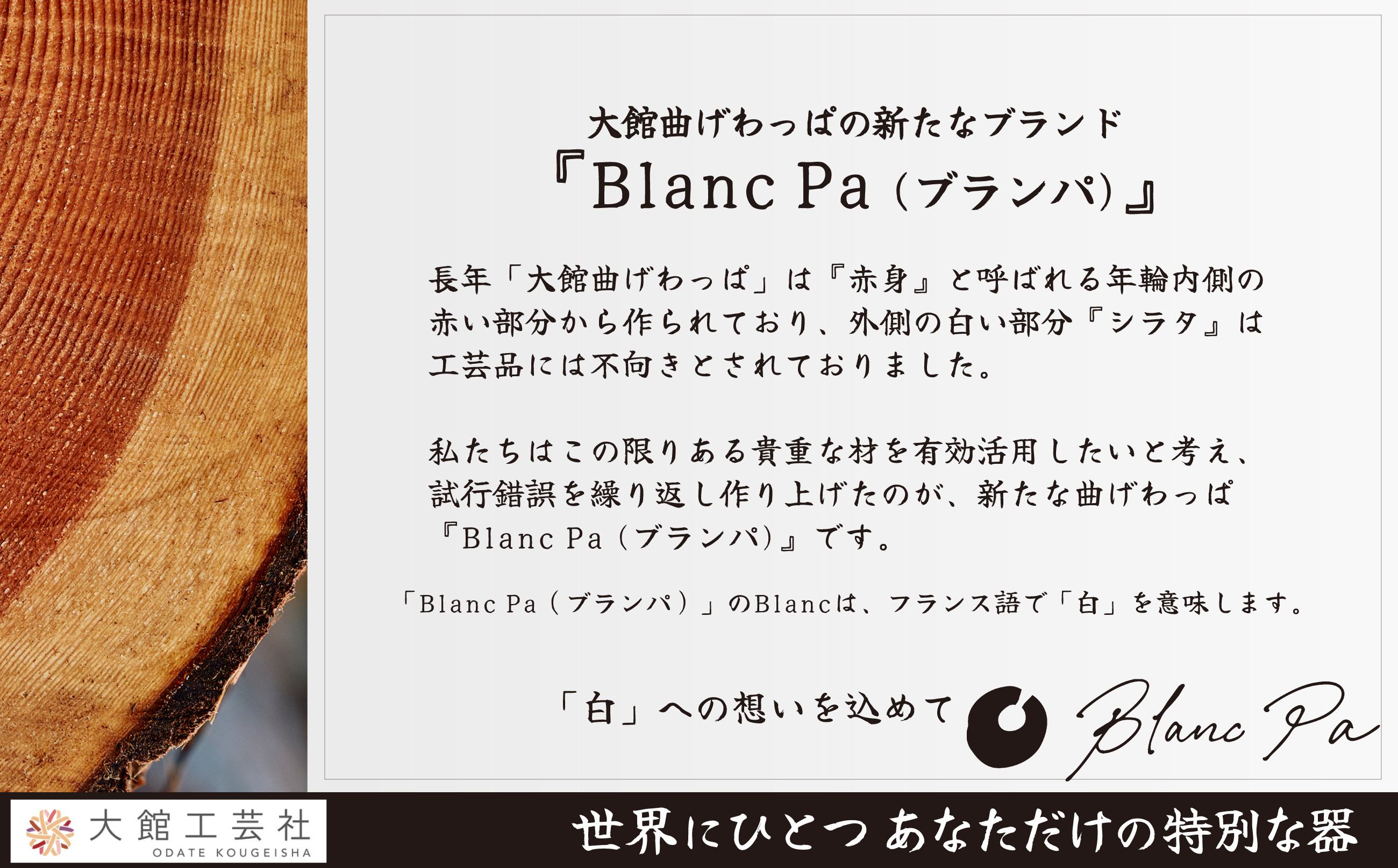 この貴重な材を有効活用したい、シラタを生きた製品に変えたいと、私たちは試行錯誤を繰り返してきました。そして度重なる試作を経て、ようやくシラタも活用し器としての品質を保った製品を作り上げる事ができました。ひとつひとつがオンリーワンの個性を持った自然な姿の木製品、日々の暮らしの道具としての伝統工芸品、それが私たちが提案する新しい曲げわっぱ「Blanc Pa」(ブランパ)です。