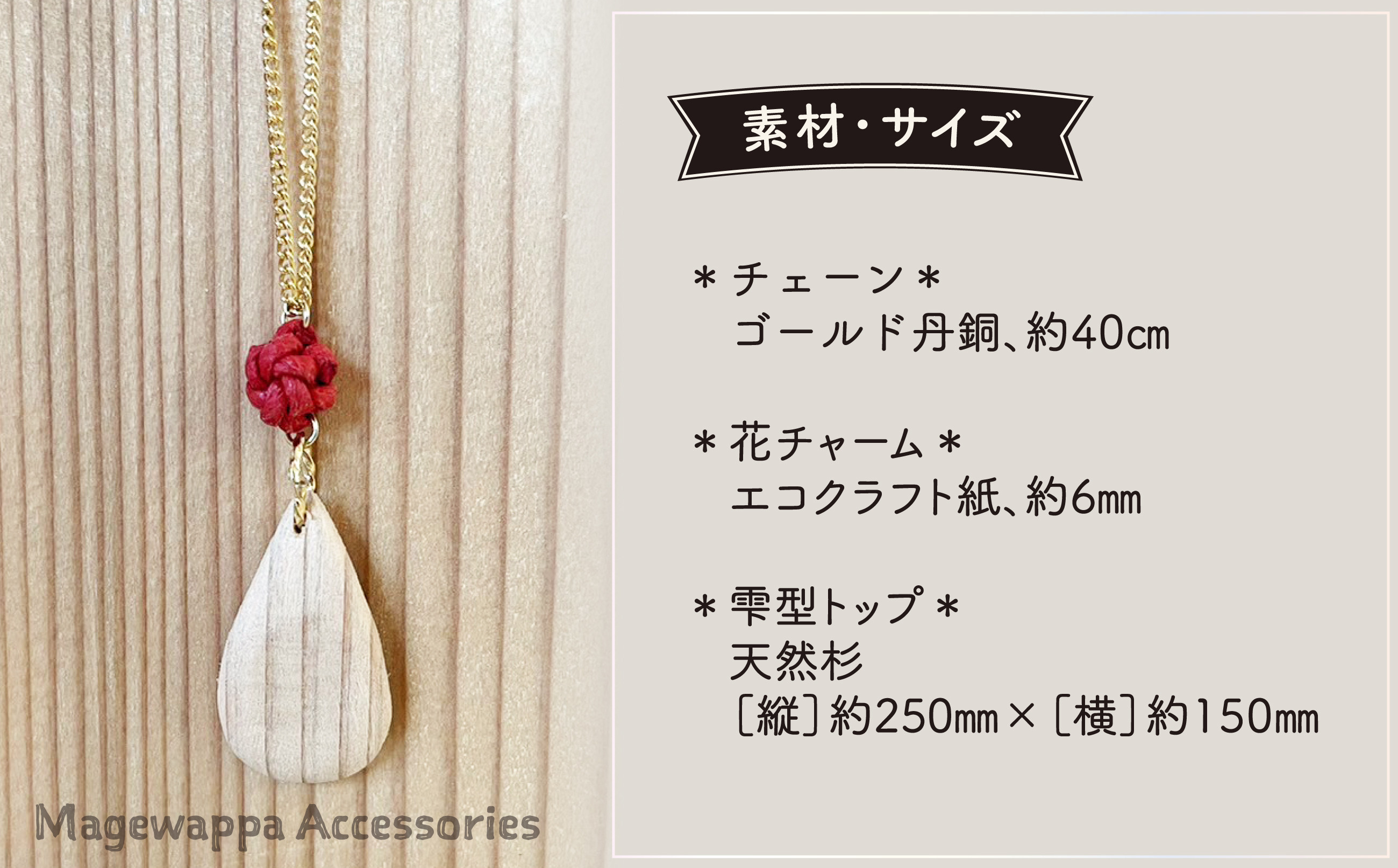 | 容量 | 【ネックレス】 チェーン約40㎝ 材質:ゴールド丹銅 エコクラフト紙花チャーム約6mm 雫型木片縦約250mm 横約150mm |