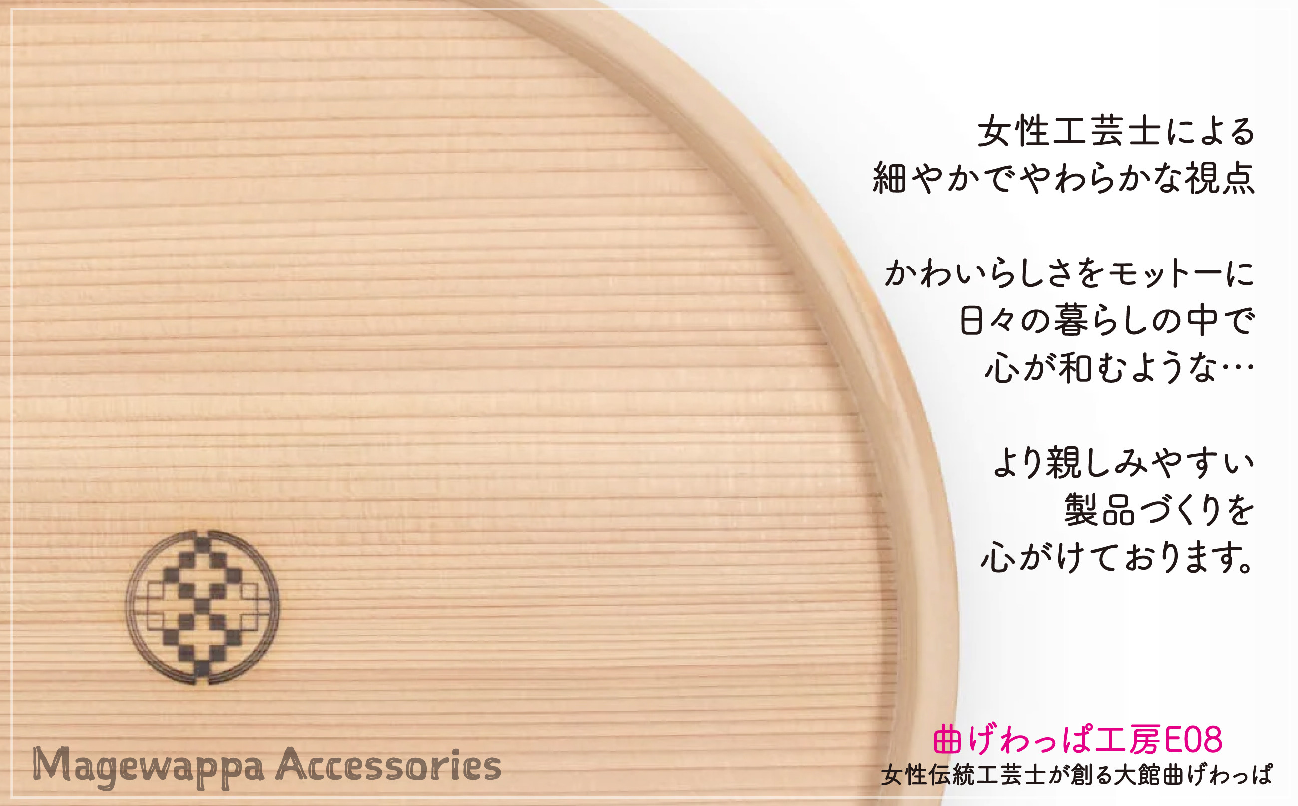 女性のニーズが高いため、自分がほしいと思うものづくりを心がけています。曲げわっぱ製作の技術を生かし、杉を使ったアクセサリーも作成しています。