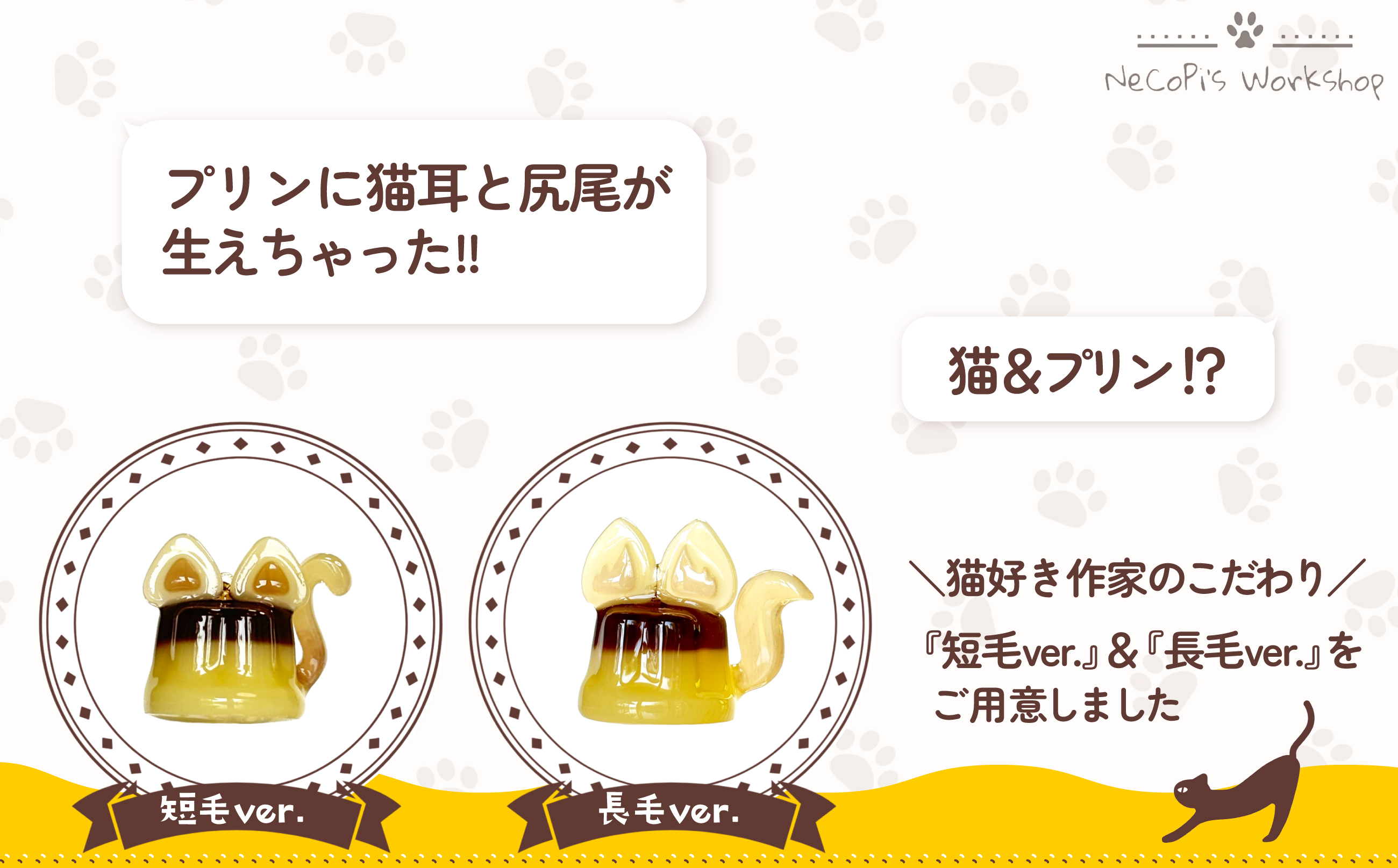 カラメルソースが乗った濃厚なめらかプリンに猫耳とシッポをくっつけてツヤツヤプルルンにコーティングすると…かわいくておいしそうなニャンニャンプリンの出来上がり。