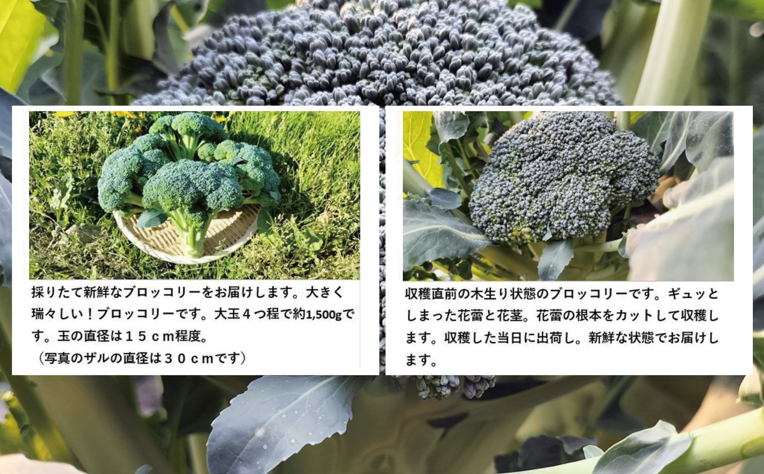 ・採りたて新鮮なブロッコリーをお届けします。大きく瑞々しい!ブロッコリーです。玉の直径は15cm程度。