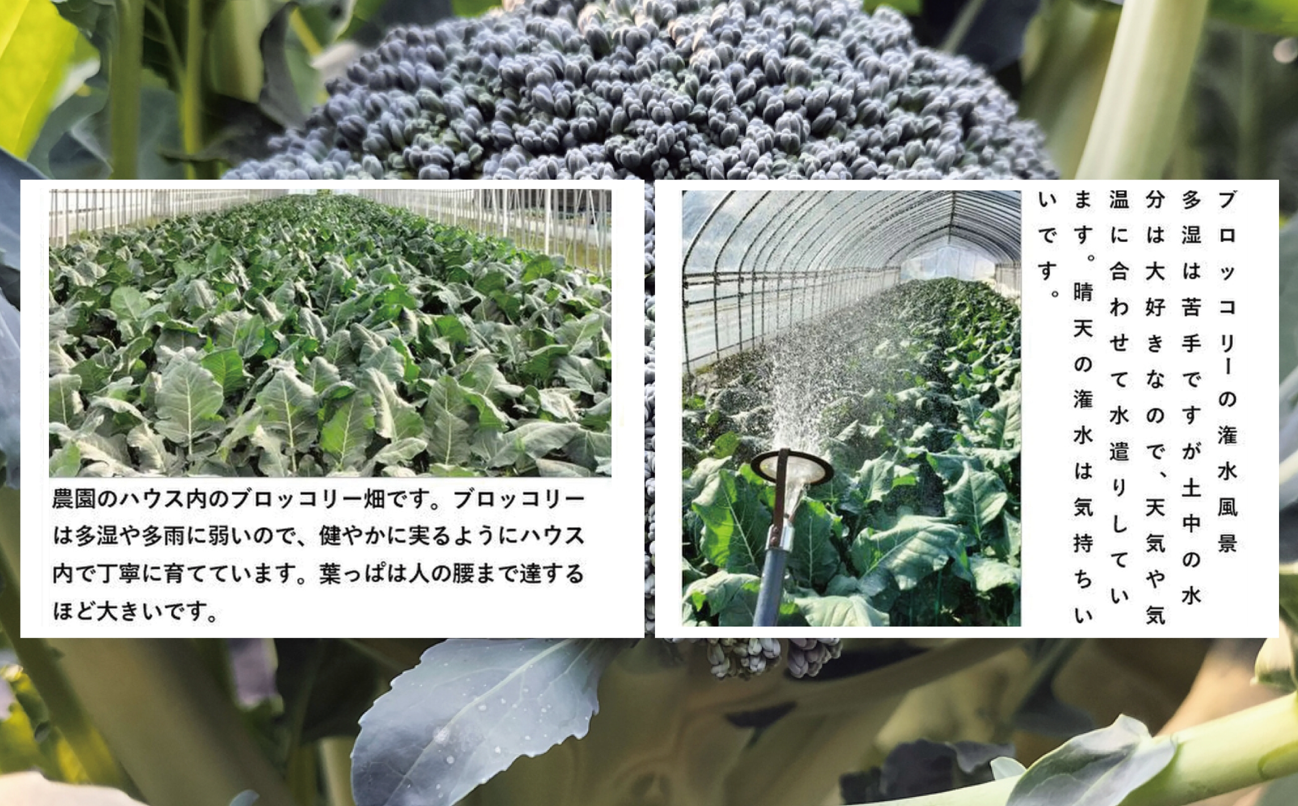 ・栽培:パイプハウスでの栽培です。ブロッコリーは多湿や多雨に弱いので、健やかに実るようにハウス内で丁寧に育てています。葉っぱは人の腰まで達するほど大きいです。