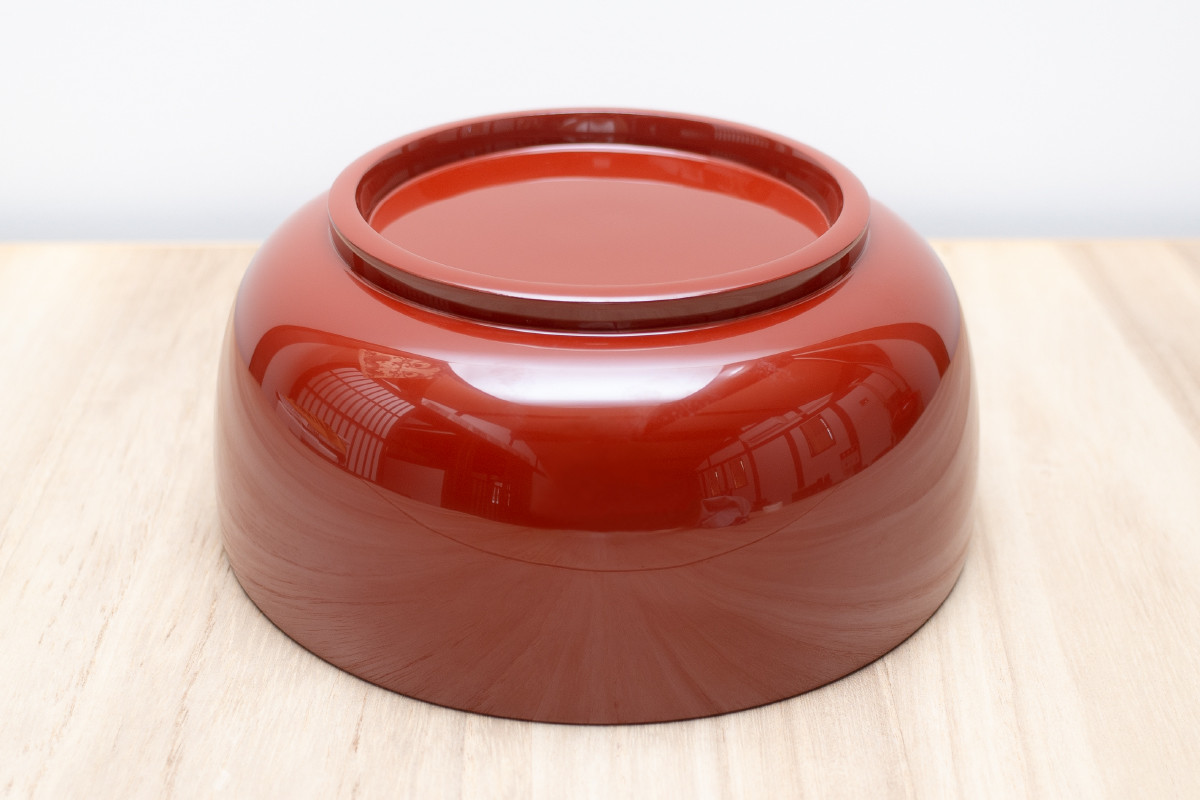1872年(明治5年)創業、伝統的工芸品 川連漆器を製造する佐藤善六漆器店により造られました。川連漆器の特徴の一つである、花塗り(はなぬり)という高度な技法で塗り上げられています。花塗りとは、塗った後に研いだり磨いたりせず、漆の流れを予測し、刷毛で塗り上げ、そのまま乾燥させる技法で、優しく柔らかな風合いに仕上がります。天然の木地に、天然の漆を使い、職人の手により一つ一つ丁寧に塗り上げられていて、使うほどに、色艶が出て、漆の味わいを楽しむことができます。漆器は、プラスチックとは違い、熱が伝わりずらく、保温効果があり、持っても熱くなく、料理も冷めにくい優れた食器です。