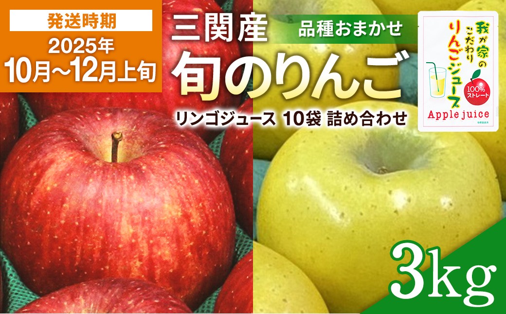 【2025年10月~12月上旬発送】三関産 旬 りんご 3kg + 果汁100 % りんごジュース 10個 セット 中生種 品種お任せ 早生ふじ シナノスイート 王林 等の中から 美味しい 林檎 をお届け 果物 ジュース 三関 【三関ゆめ蔵ぶ直売所】[B3-2606]