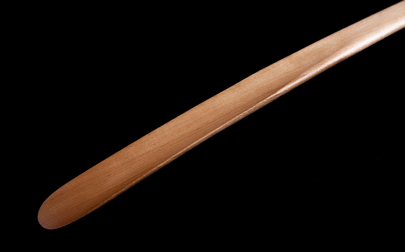 日本一堅いといわれる木材「斧折樺(オノオレカンバ)」を用い30年前に考案。弓なりに伸びる美しい造形の靴べら。 素材が堅いため加工は難しいですが、丹念に手作業で削り磨くことで、この美しさ、丈夫さ、使い勝手がそろった商品が生まれます。