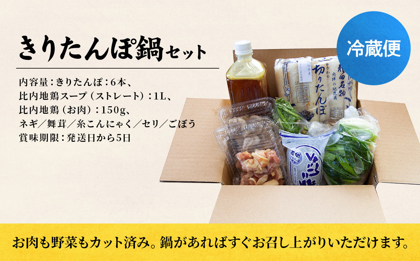 | 容量 | 【きりたんぽ鍋セット3人前】 きりたんぽ:6本 自家製比内地鶏スープ(ストレート):1L 比内地鶏(お肉):150g ネギ/舞茸/糸こんにゃく/セリ/ごぼう |
