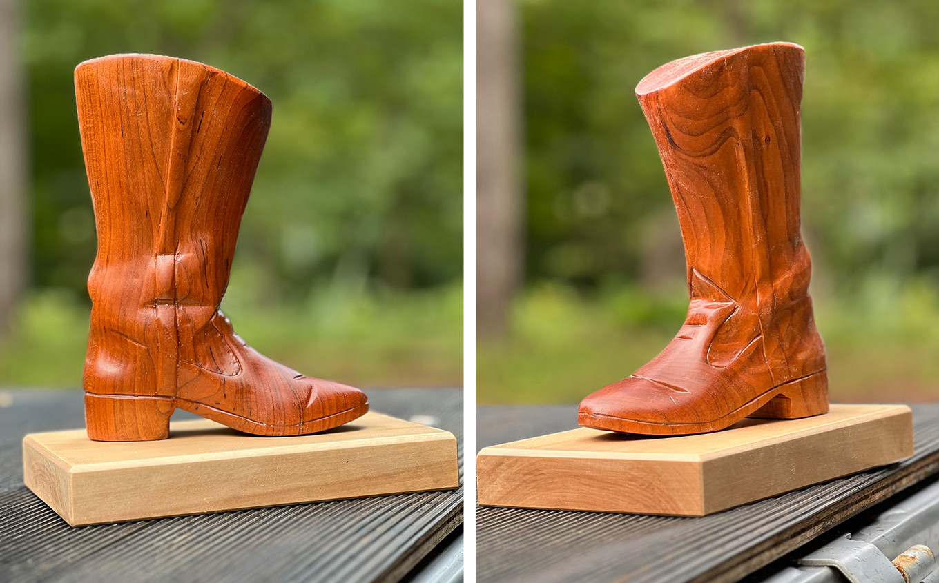 樹のブーツには秋田県の山桜を使用し、靴べらと台座には斧折樺(オノオレカンバ)を使用しています。