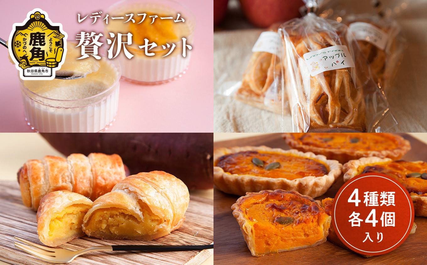 アップルパイ、桃のムース、パンプキンパイ、スイートポテトパイの贅沢セット レディースファーム贅沢セット 4種×各4個(合計16個入り)【レディースファーム】スイーツ お菓子 バレンタインデー ホワイトデー 家庭用 完熟 国産 お中元 お歳暮 贈り物 贈答用 グルメ ギフト 故郷 秋田 あきた 鹿角市 鹿角 送料無料