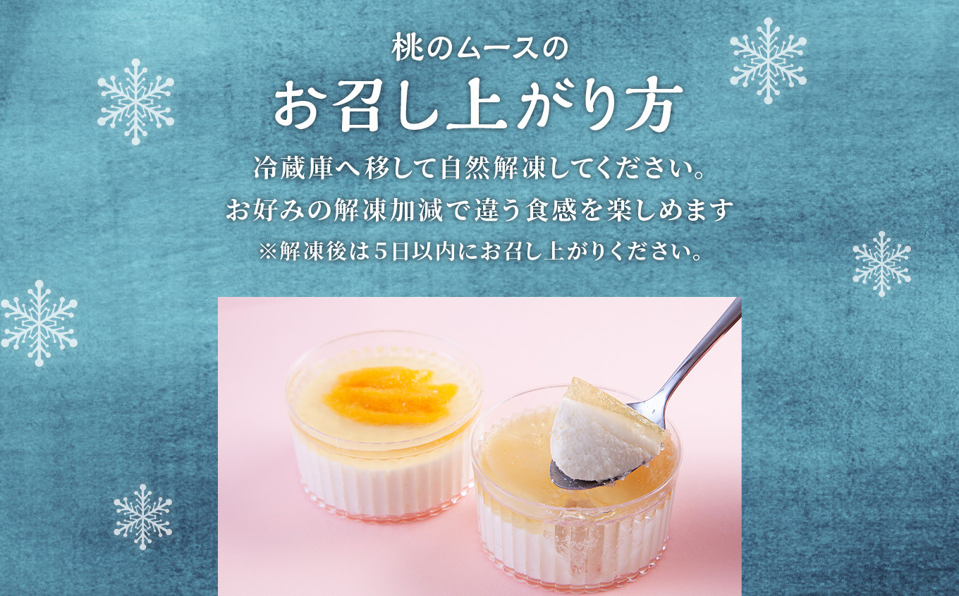 桃のムース:桃(秋田県鹿角産)、砂糖、牛乳、生クリーム、ゼラチン、リキュール/クエン酸、ビタミンC、(一部に乳を含む)