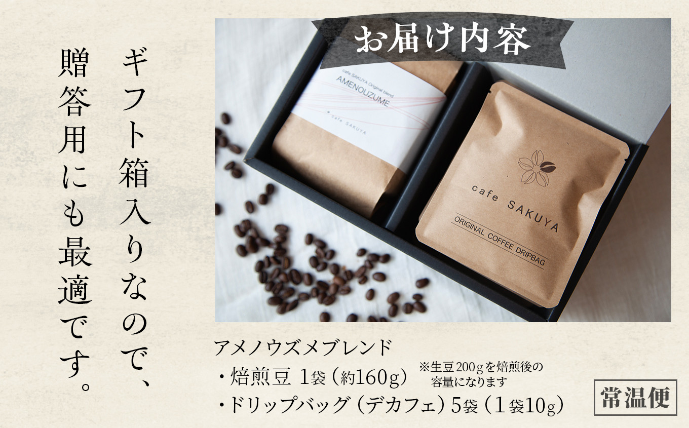 あなた好みの一杯に出会える、自家焙煎珈琲店。 サクヤオリジナルブレンドコーヒー「アメノウズメ」焙煎豆+デカフェドリップバッグ【cafe SAKUYA】(アメノウズメブレンド焙煎豆 約160g×1袋/デカフェドリップバッグ 約10g×5袋) 珈琲 coffee 焙煎 オリジナル ブレンド ギフト 贈り物 贈答 プレゼント 秋田県 秋田 あきた 鹿角市 鹿角 かづの
