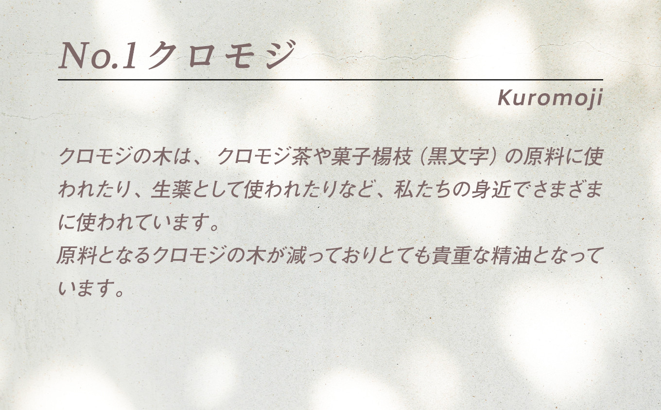クロモジ精油:花のようなフローラルな香りと森林を思わせるウッディな香りが調和した、香水のローズウッドに似た香りが特徴。